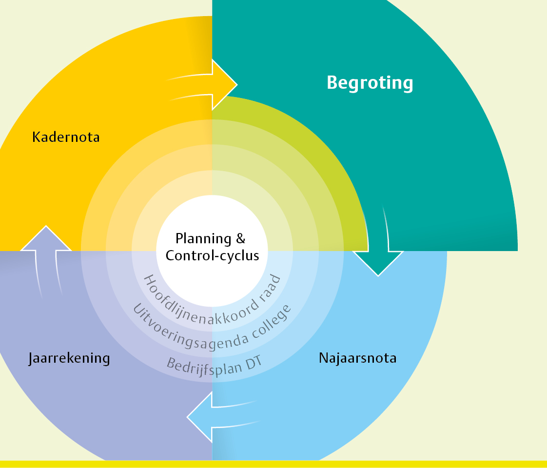 De gemeenteraad geeft het college financiële en inhoudelijke kaders mee voor het beleid en de uitvoering daarvan. Het uitgangspunt voor deze kaderstellende rol is het raadsakkoord 2022-2026 'Bouwen aan de toekomst'. Dit akkoord bepaalt in hoge mate de inhoud van de documenten in de jaarlijkse begrotingscyclus: kadernota, meerjarenbegroting, voorjaarsnota, najaarsnota en jaarstukken. De kadernota is een uitwerking van de bestuurlijke agenda. Het is een koersbepalend document met financiële en inhoudelijke kaders voor het daarop volgende begrotingsjaar. In de programmabegroting worden de voornemens van de kadernota geconcretiseerd. De begroting is een wettelijk voorgeschreven document waarmee de gemeenteraad het college autoriseert tot het doen van uitgaven voor bepaalde doelen. Na vaststelling van de begroting geven de voorjaarsnota en de najaarsnota tussentijds een overzicht van de stand van zaken van de financiën en de uitvoering van beleid. Ook kunnen in deze nota's budgetten worden bijgesteld. In de jaarstukken tenslotte wordt verantwoording afgelegd over het gevoerde beleid en het financiële beheer. In de figuur is de planning- en controlcyclus schematisch weergegeven.